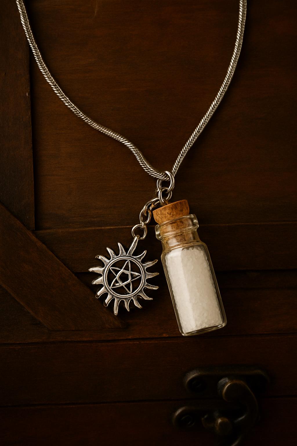 Salt is known in supernatural folklore as a powerful protective element, while the anti-demon charm represents warding and strength. Together, they create a striking piece that blends fandom inspiration with everyday wearable style.