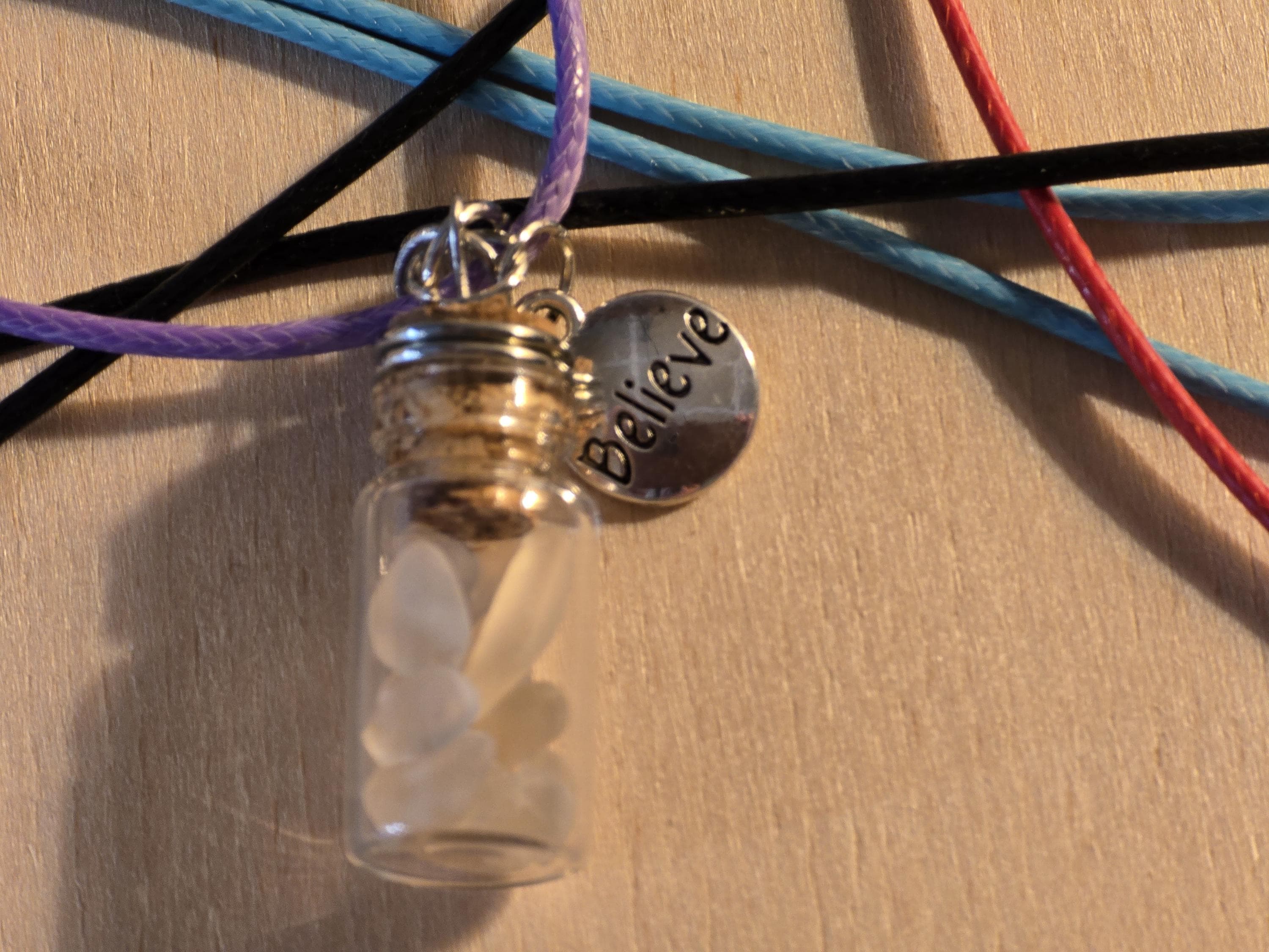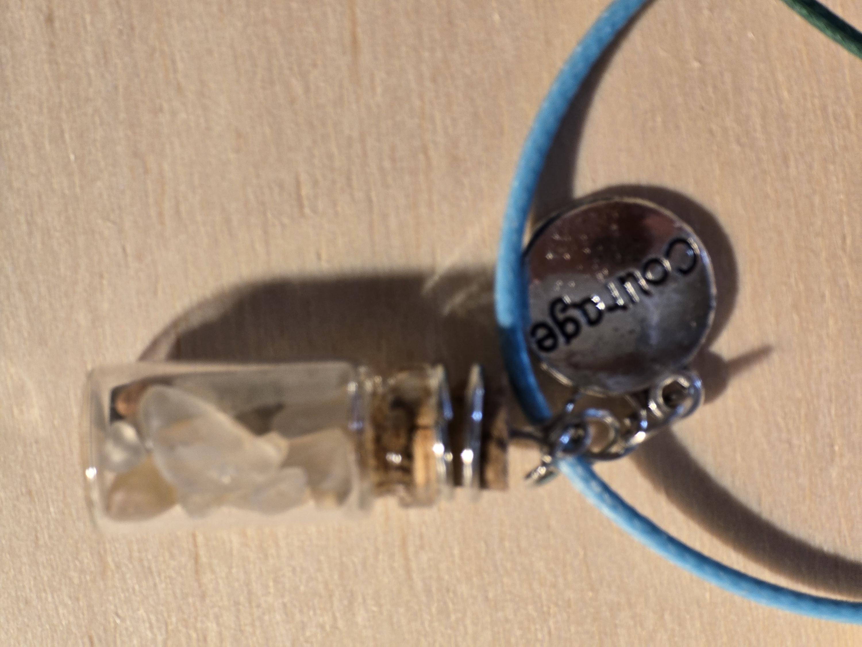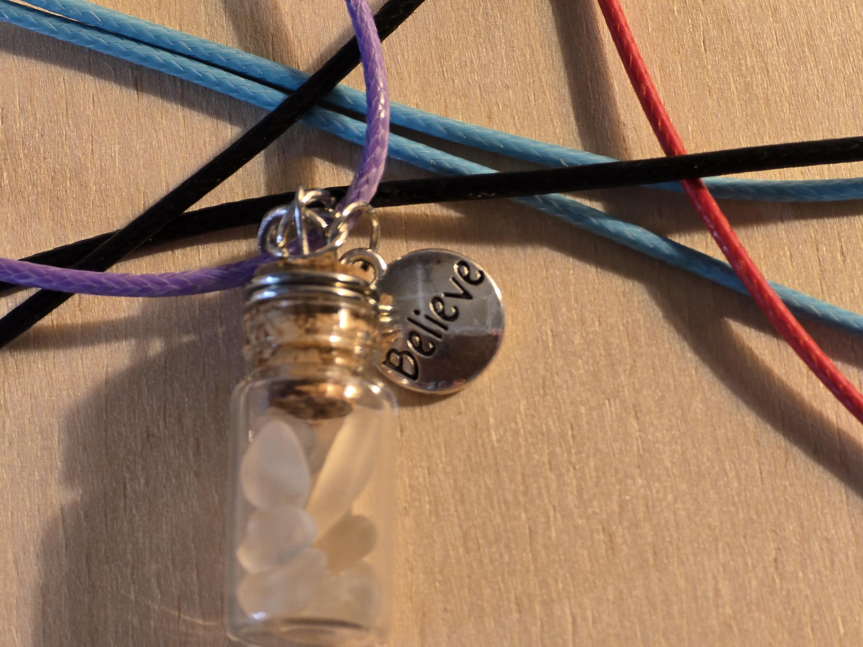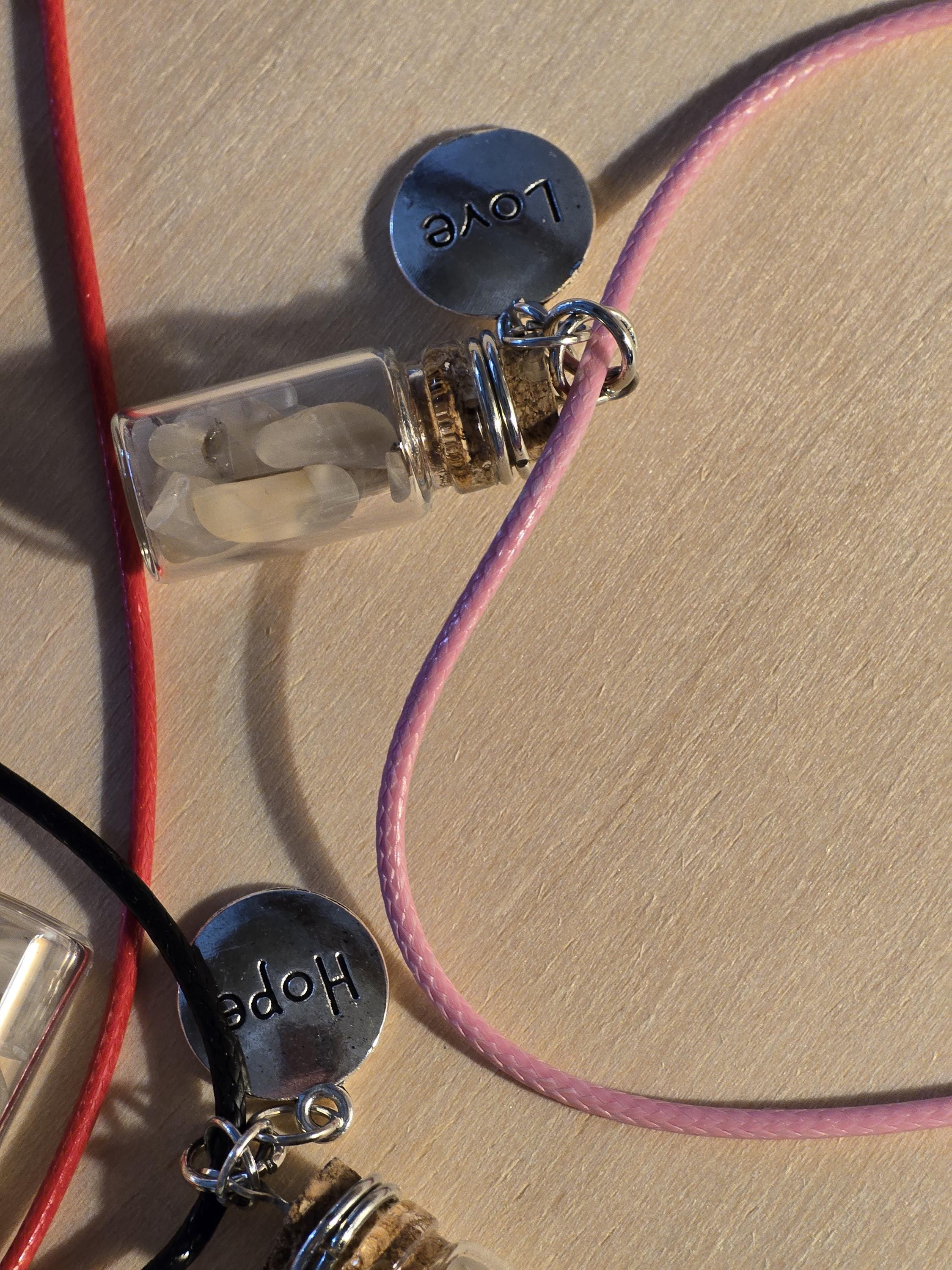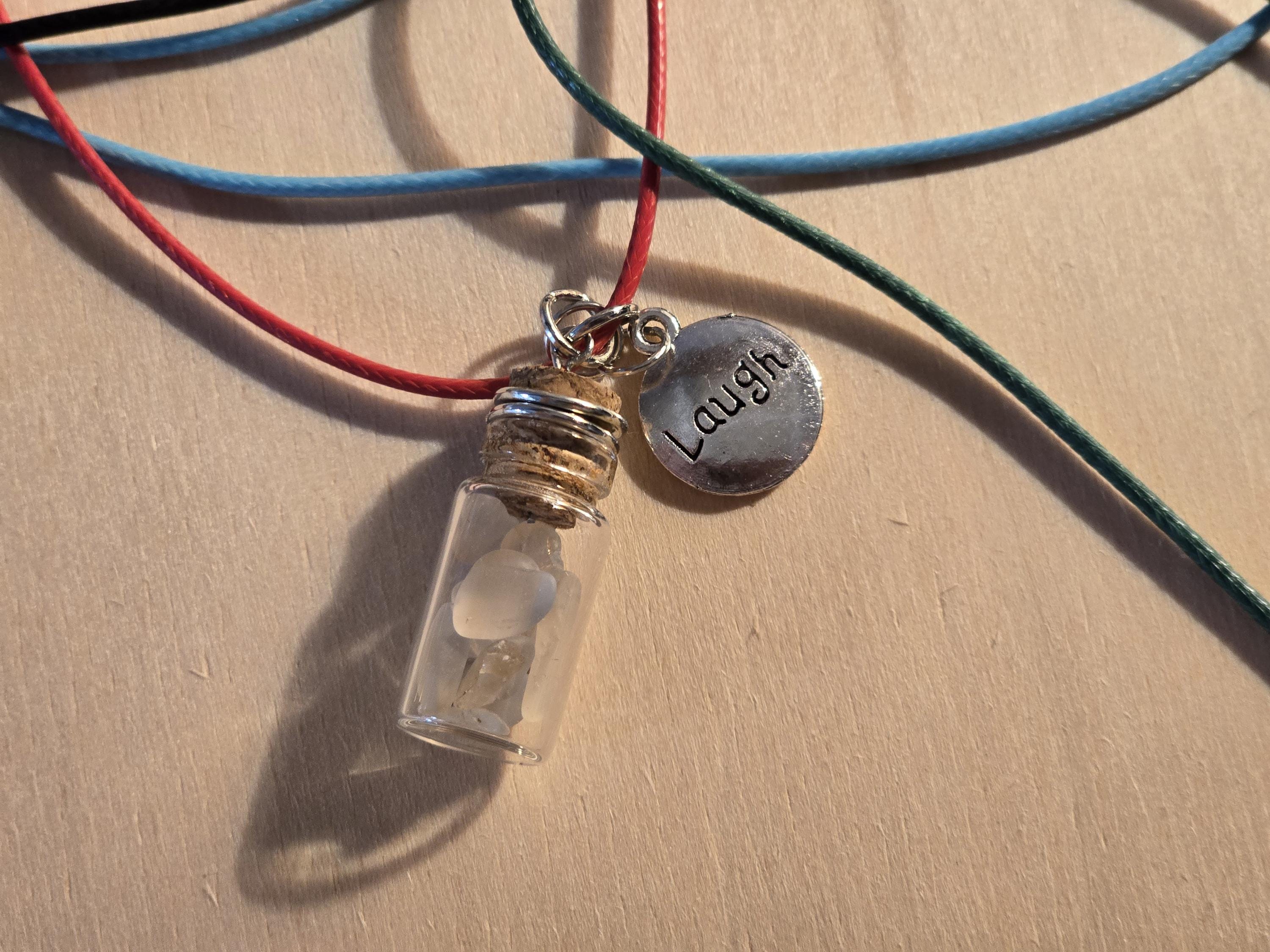 These Glass Jars are 0.5ml and 1.5ml, hanging from an 18-inch nylon colored cord with an extra 2-inches of chain, and using a lobster claw for a clasp.