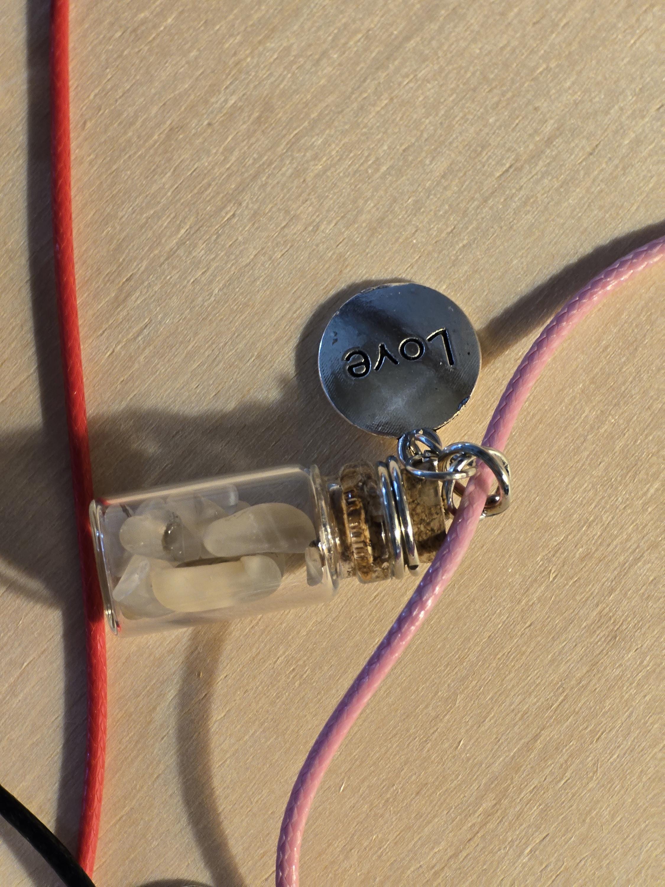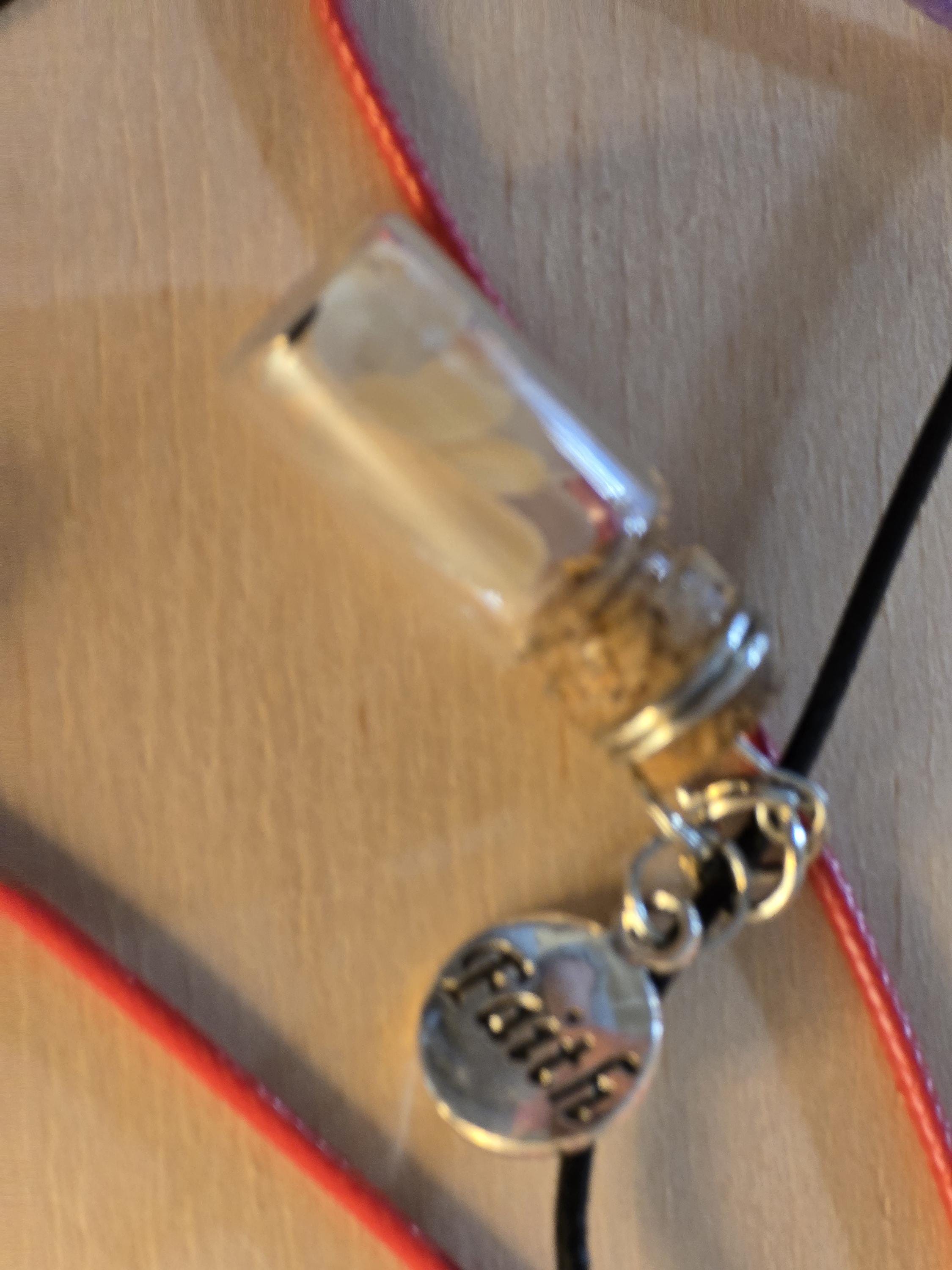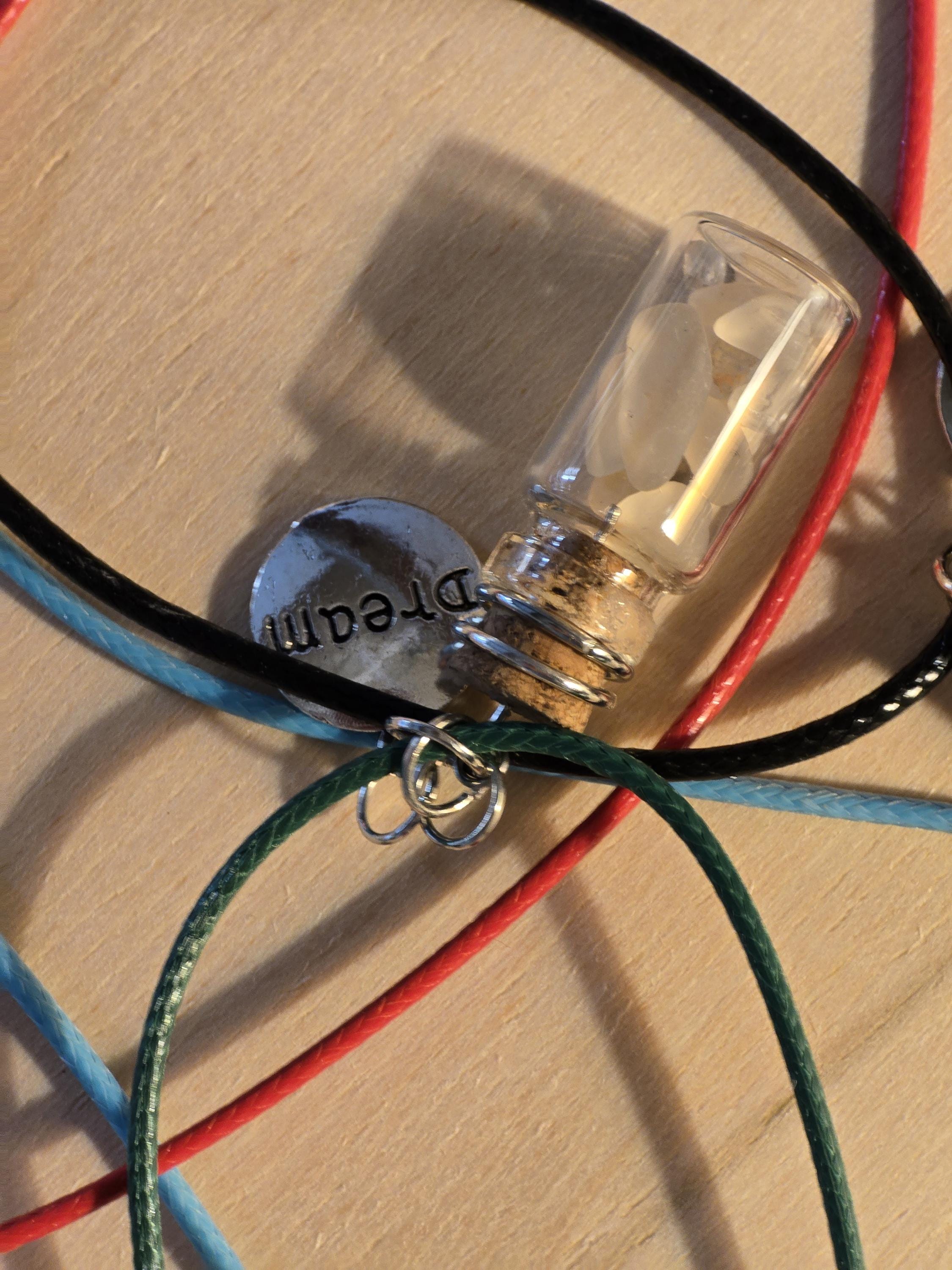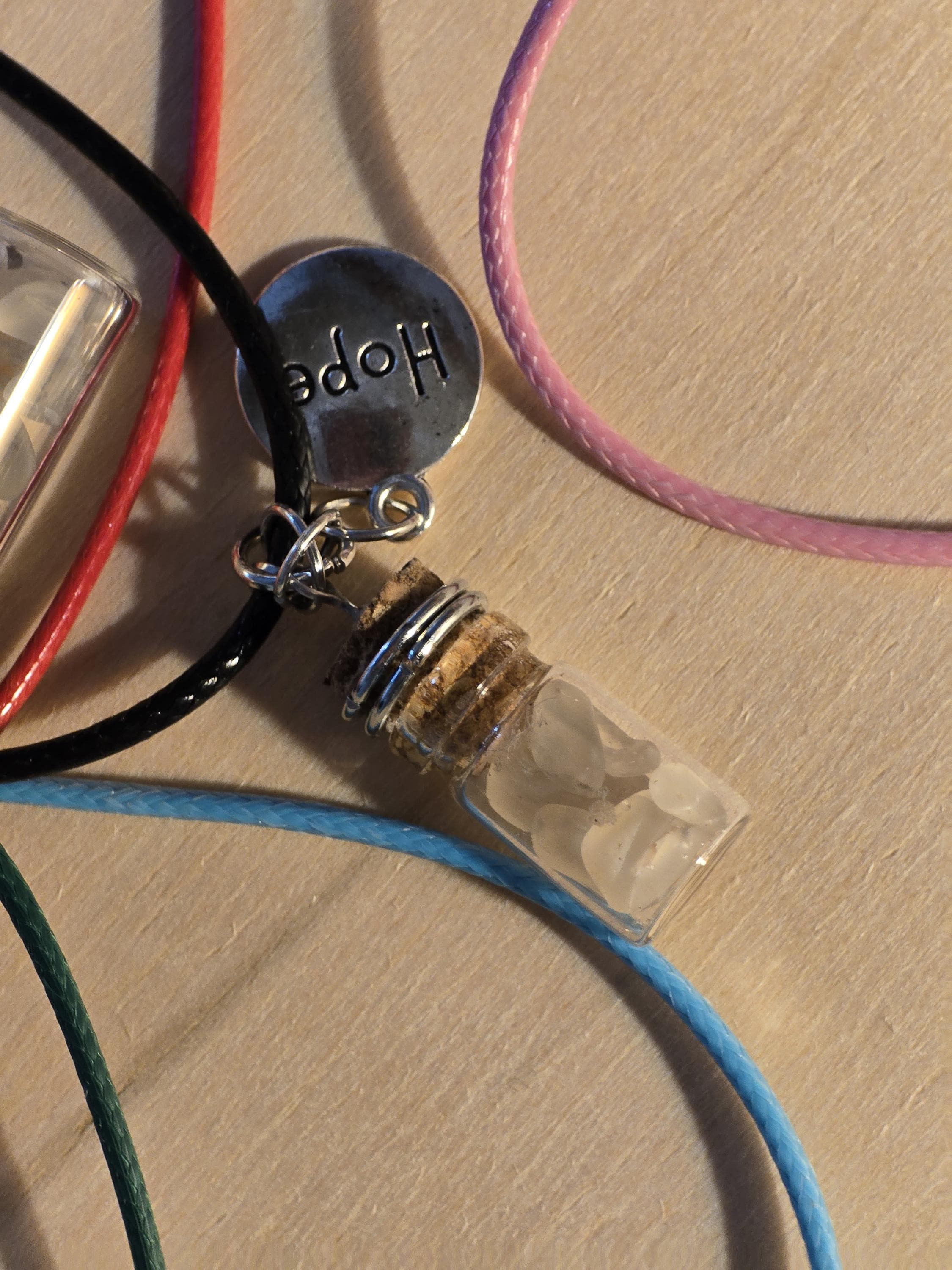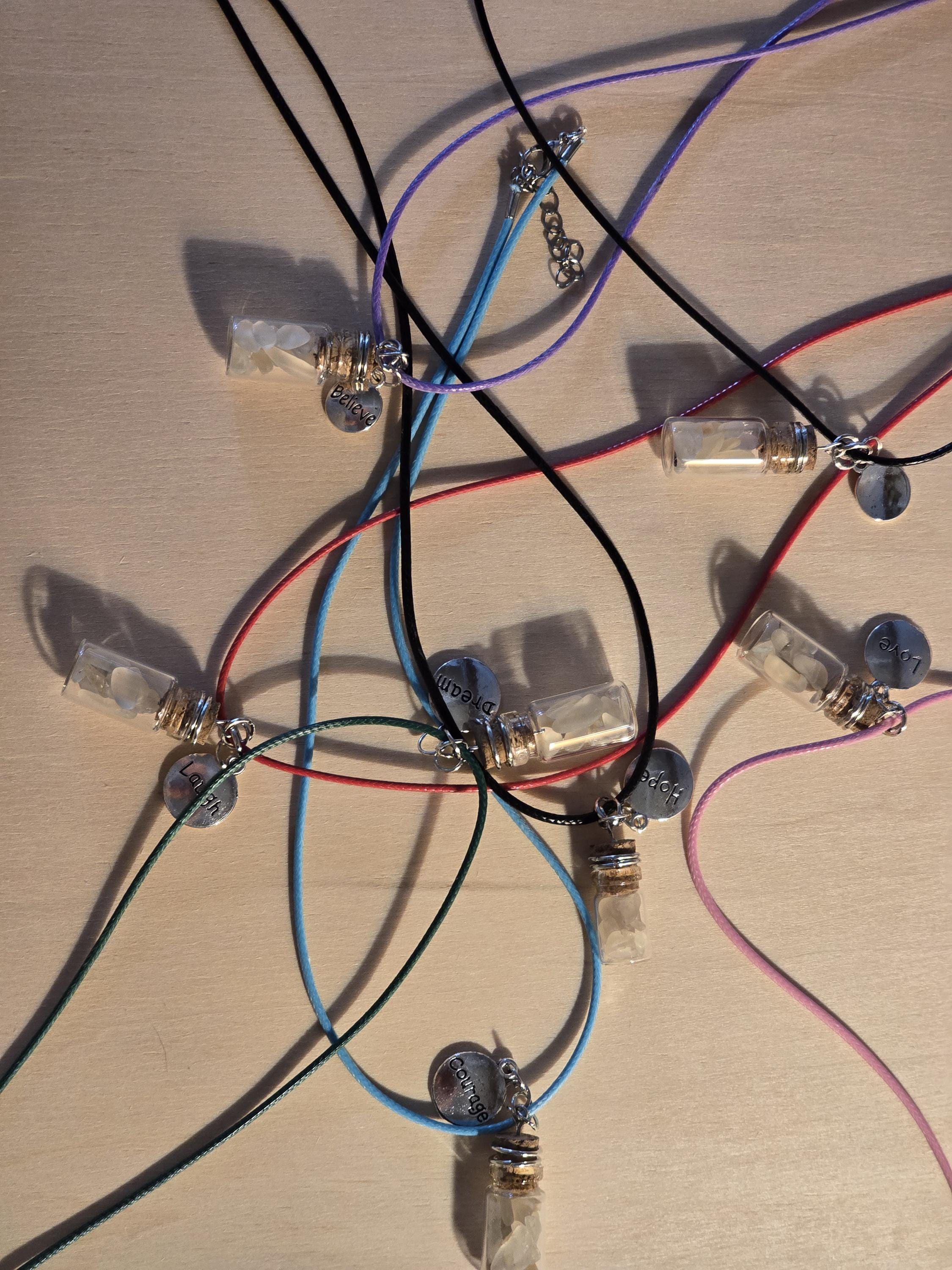 These Glass Jars are 0.5ml and 1.5ml, hanging from an 18-inch nylon colored cord with an extra 2-inches of chain, and using a lobster claw for a clasp.