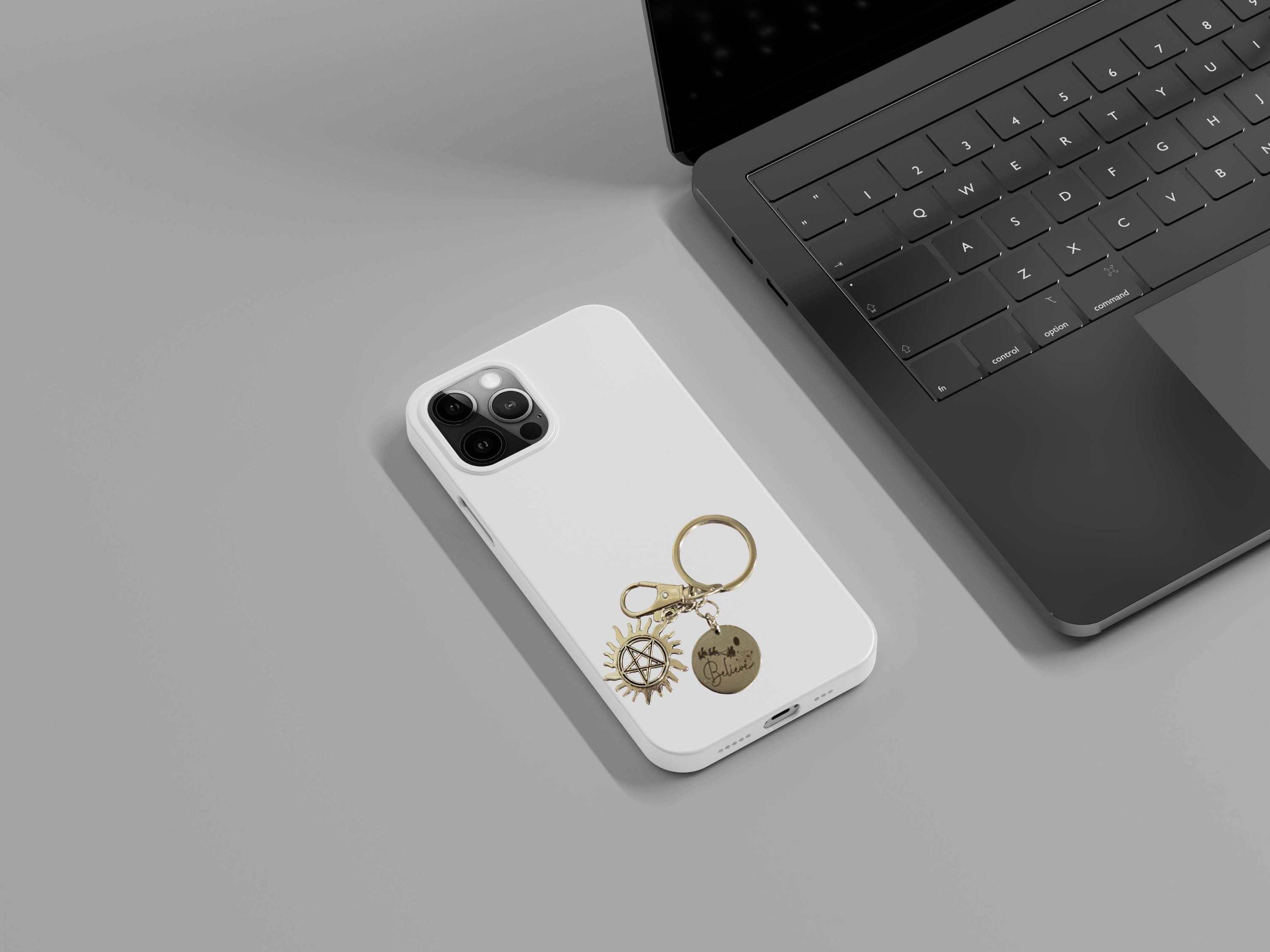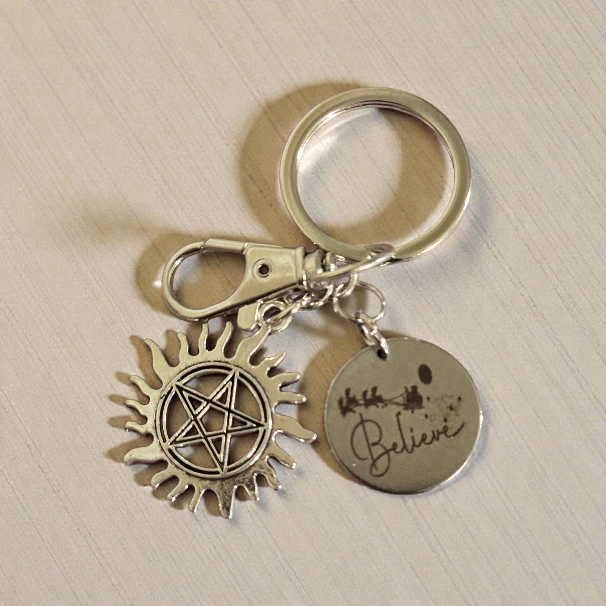 Supernatural keychain, pentagram evil eye charm, and a circular Christmas Charm attached. The charm is engraved Believe with a sleigh and reindeer.