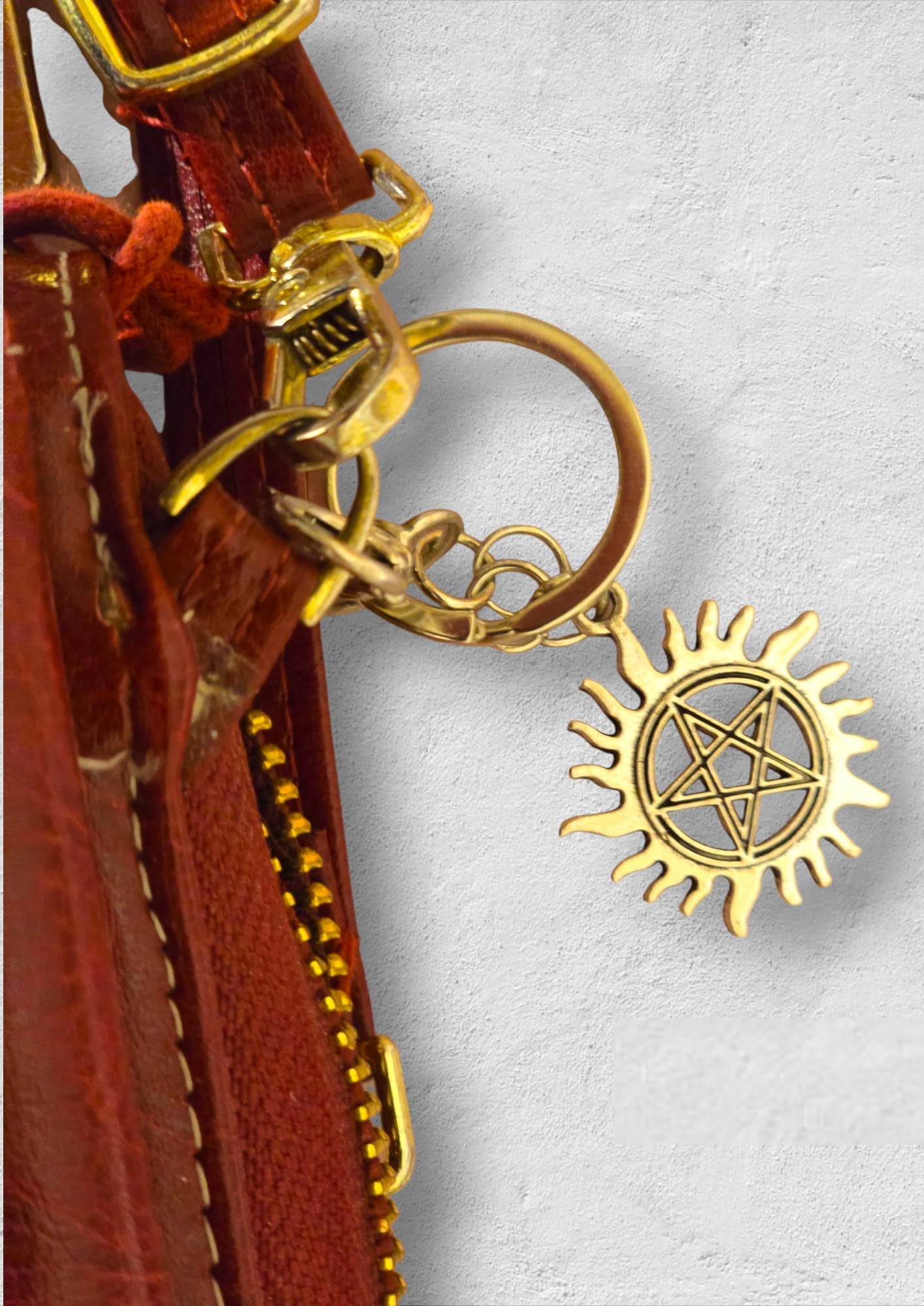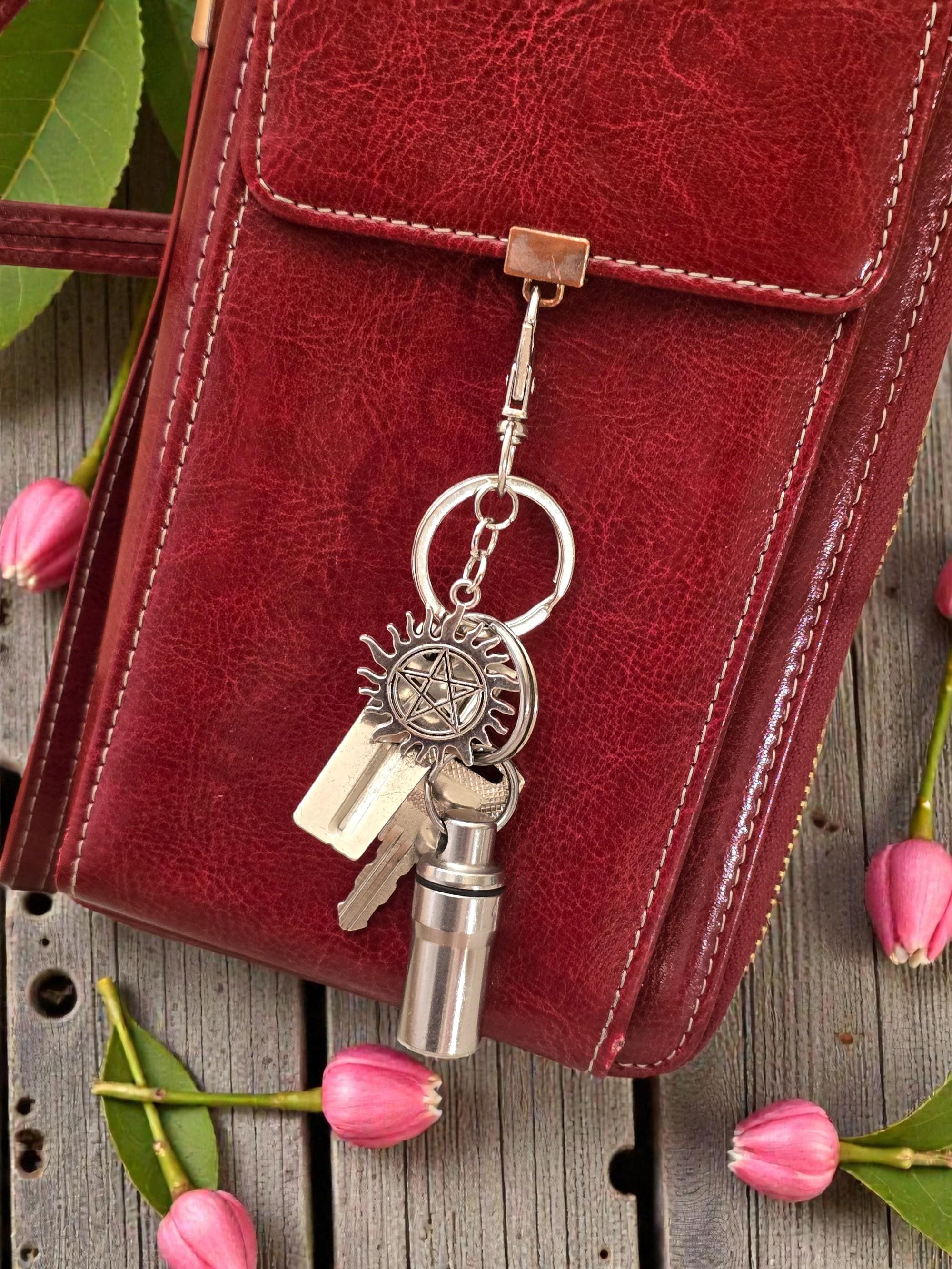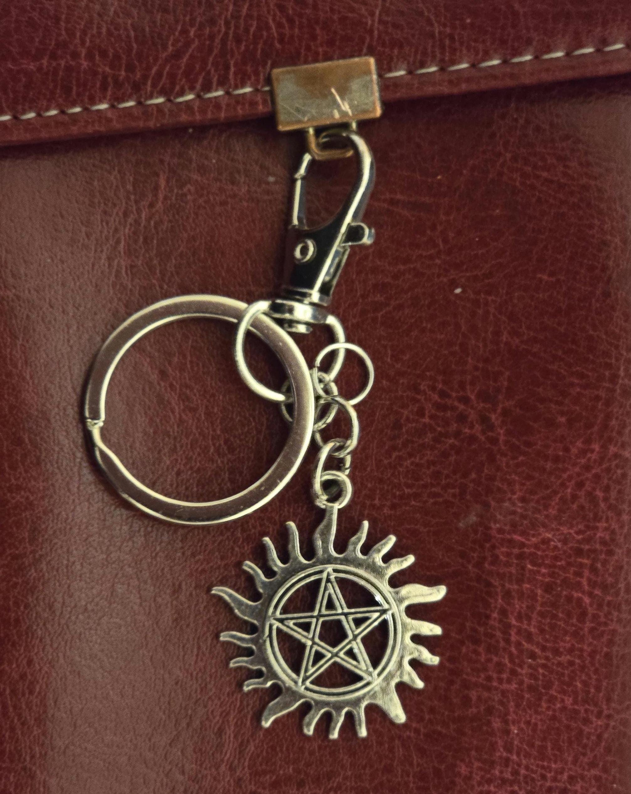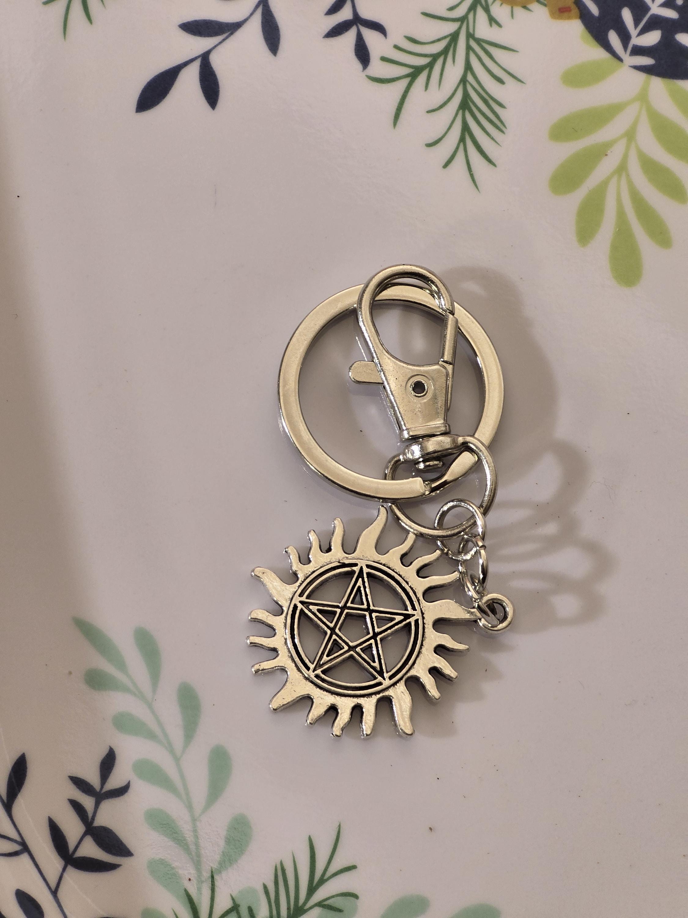 Supernatural silver metal keychain with clip, chain link, and iconic anti-demon possession charm.