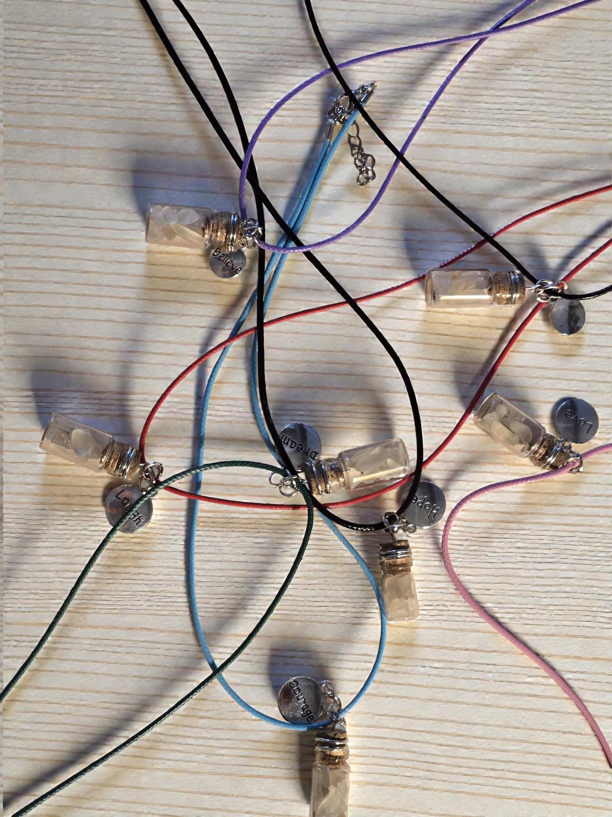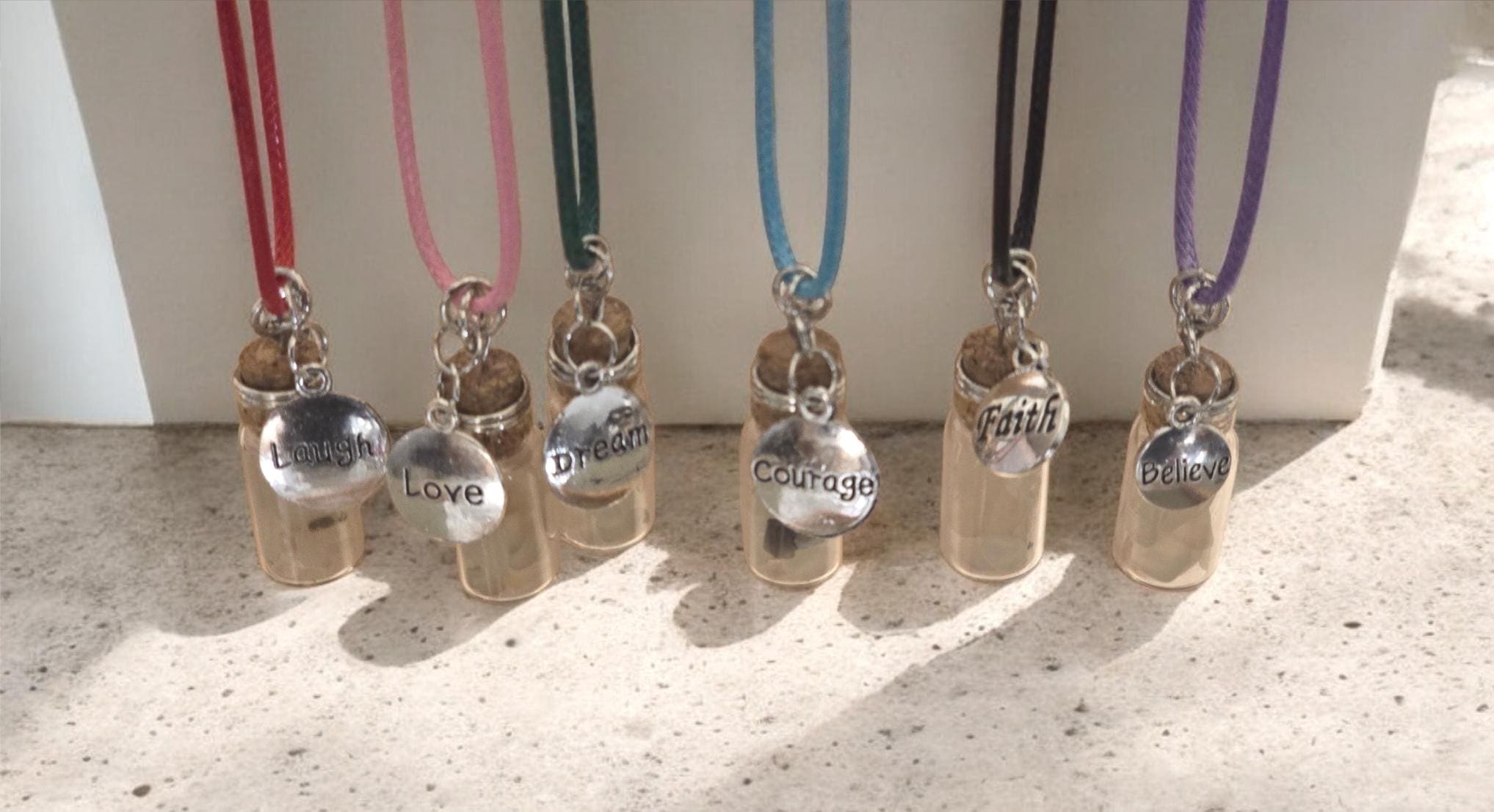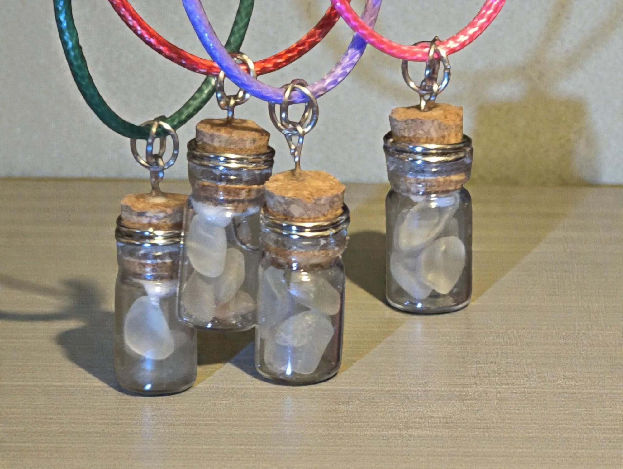 These Glass Jars are 1.5ml, hanging from an 18-inch nylon colored cord with an extra 2-inches of chain, and using a lobster claw for a clasp.