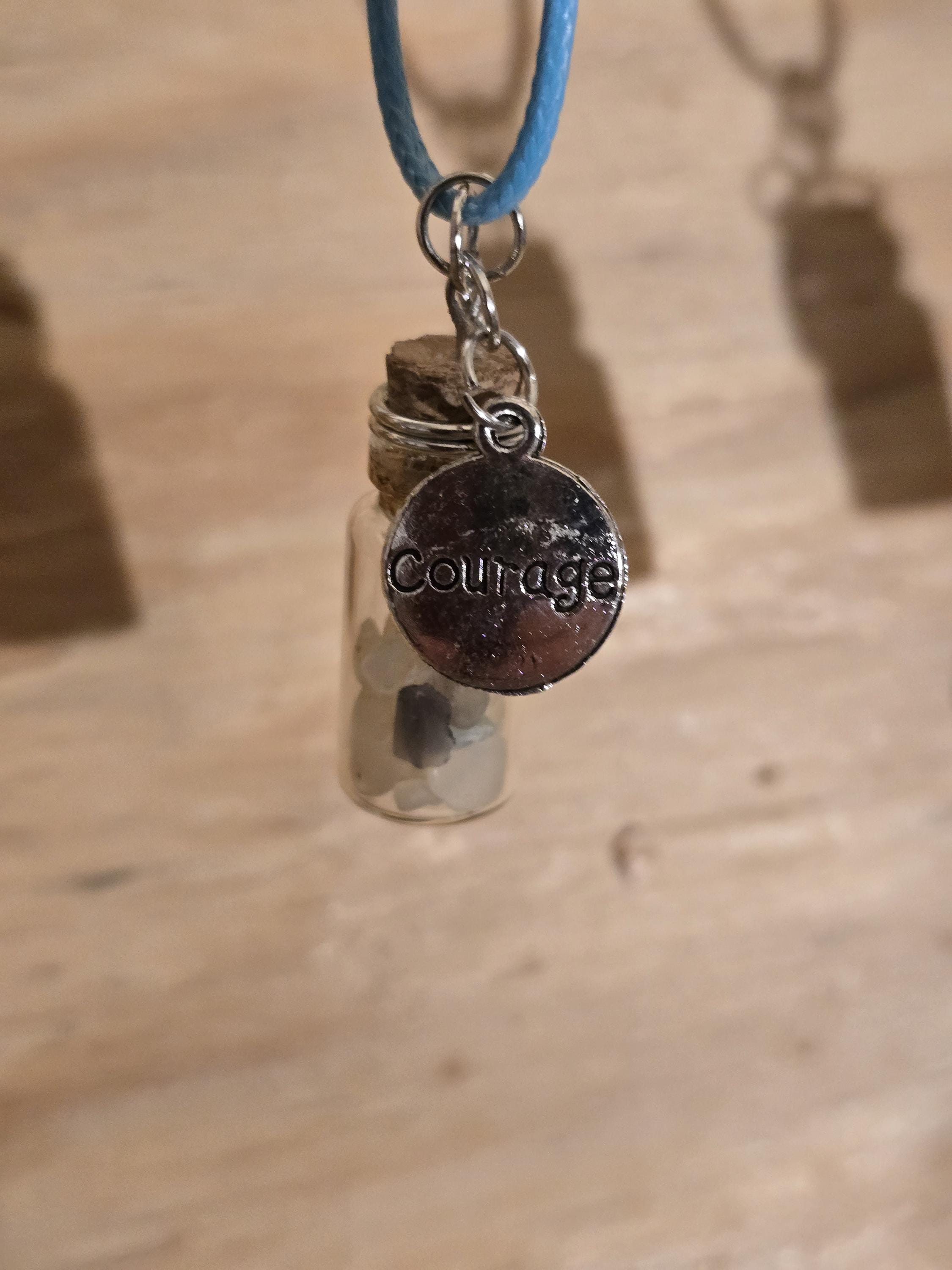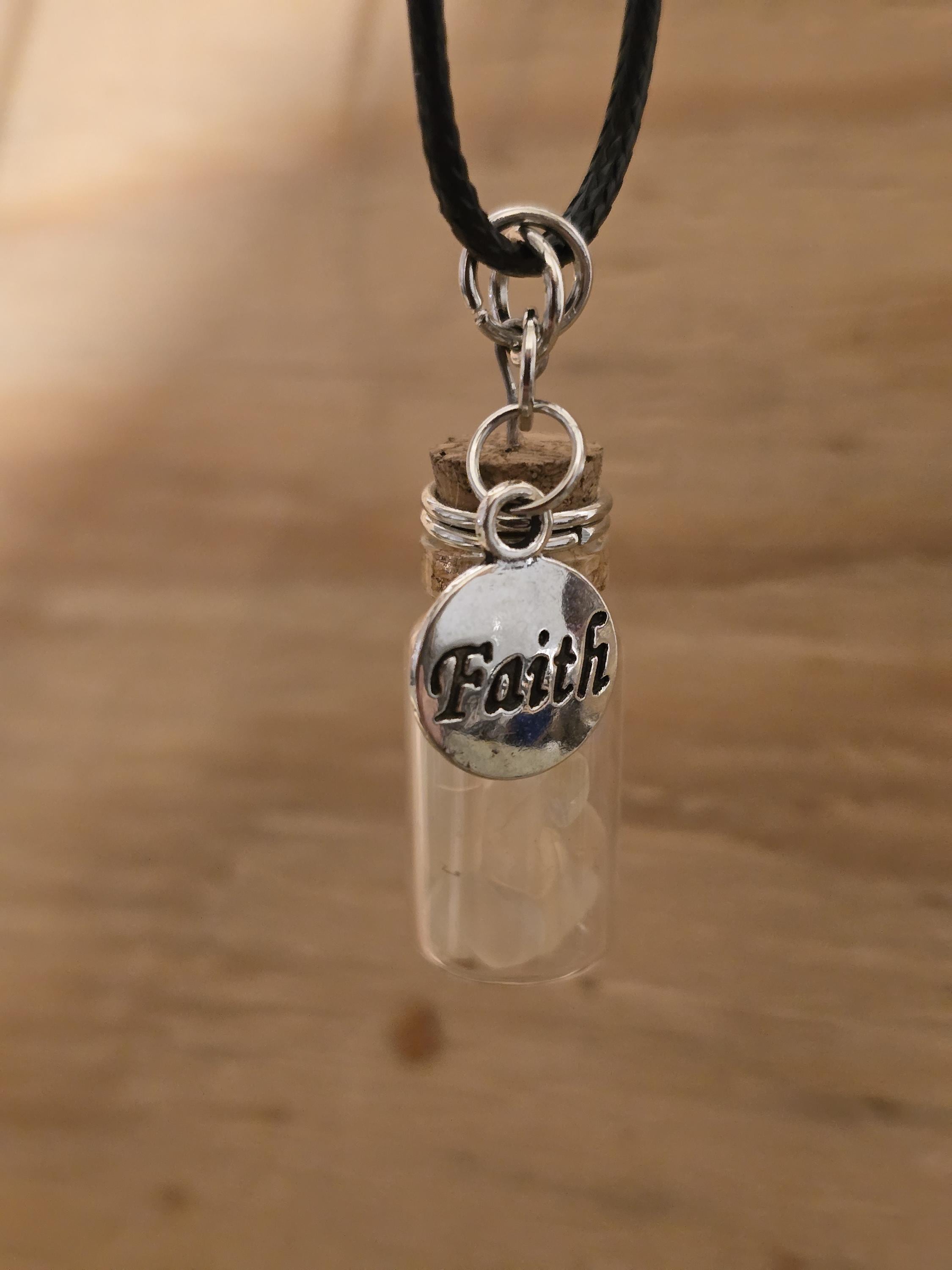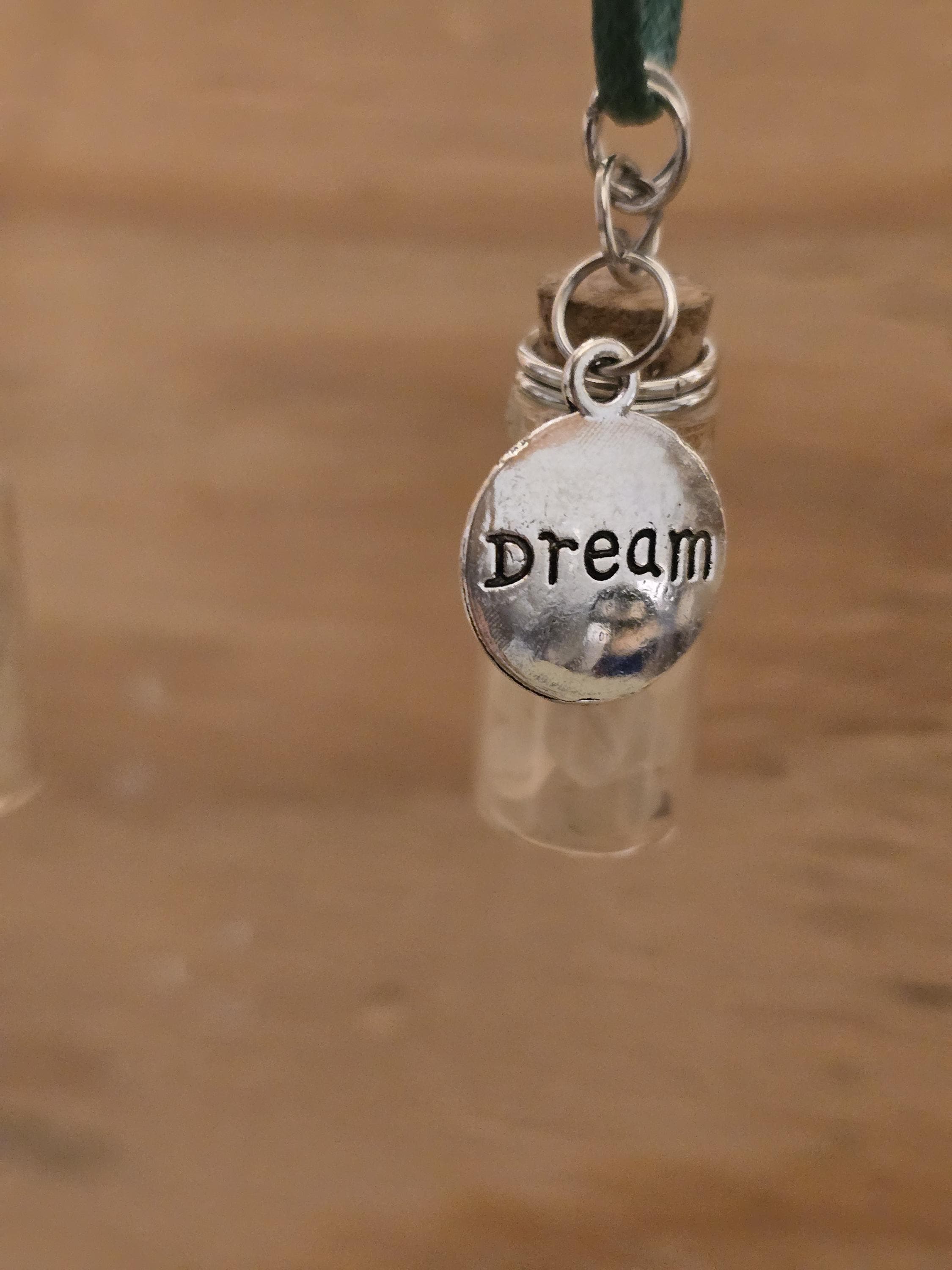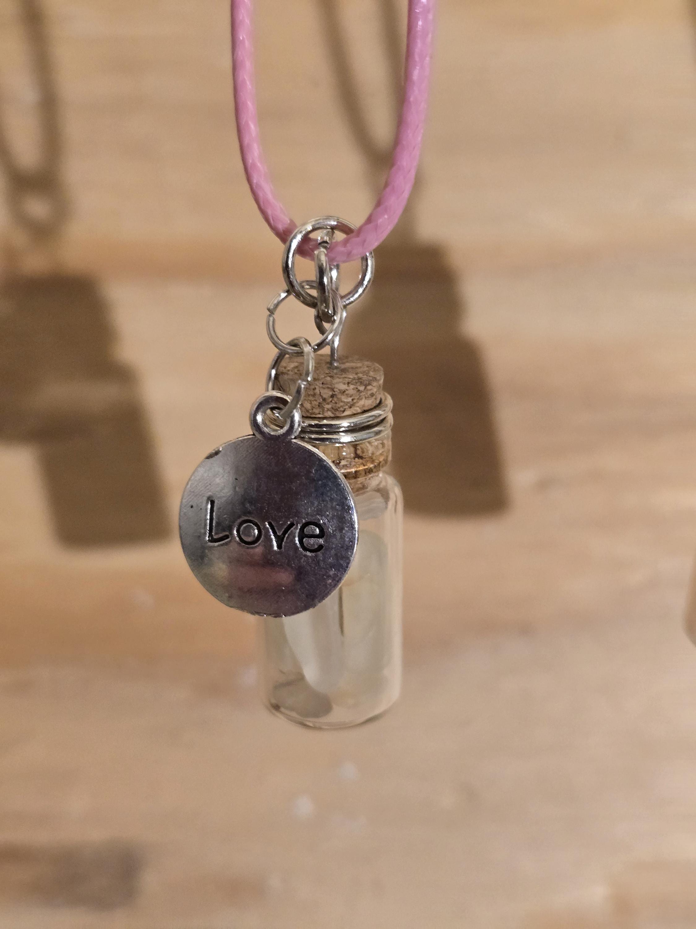 These Glass Jars are 1.5ml, hanging from an 18-inch nylon colored cord with an extra 2-inches of chain, and using a lobster claw for a clasp.
